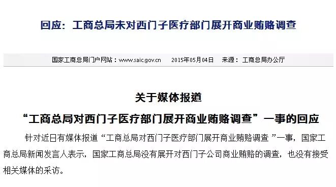 当天,国家工商总局官网上,唯一发布的“工商要闻”就是《回应:工商总局未对西门子医疗部门展开商业贿赂调查》,该文注明来源为“工商总局办公厅”。